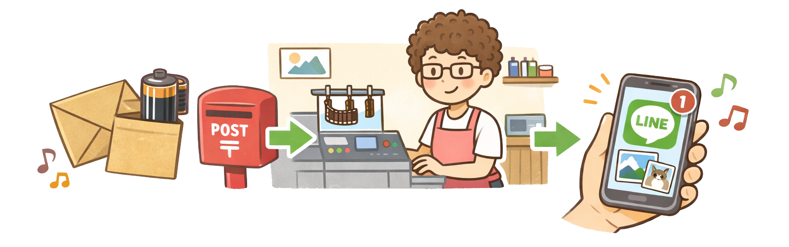 フィルム郵送 → 現像・データ化 → LINEで画像転送 → 完了